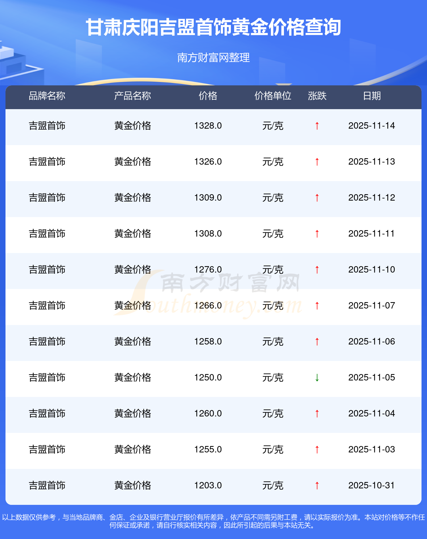 甘肅慶陽吉盟首飾黃金價(jià)格每克多少錢,今天黃金一克的價(jià)格具體是多少?今日甘肅慶陽吉盟首飾黃金價(jià)格查詢,今日(2025年11月16日),甘肅慶陽吉盟首飾黃金價(jià)格每克的價(jià)值為1328.0元/克。