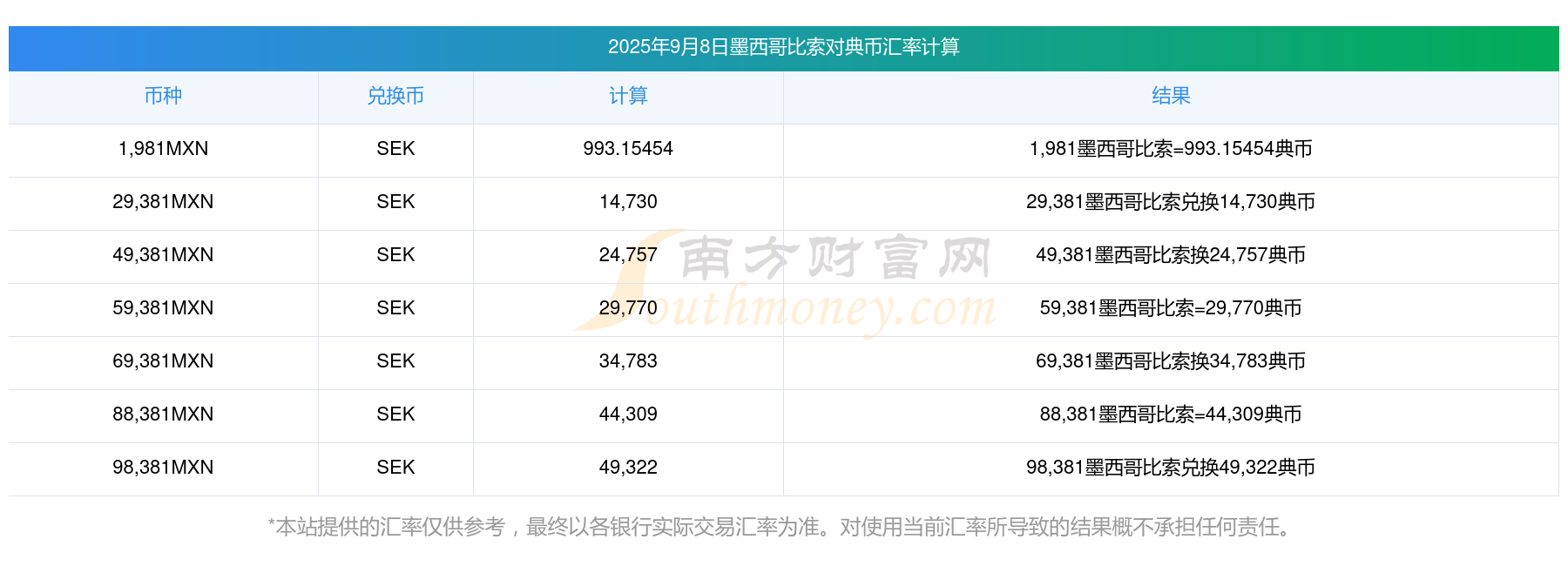 2025年9月8日今天匯率,換算墨西哥比索(MXN)到典幣(SEK):