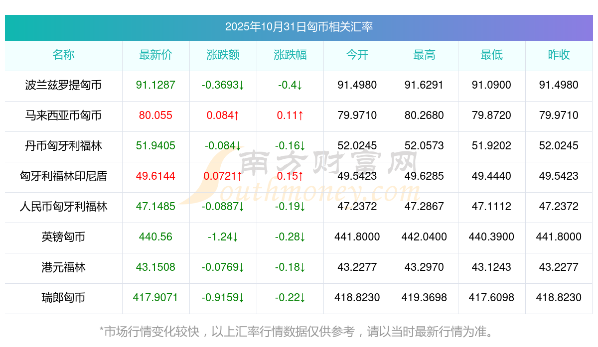 2025年10月31日匈幣兌換哥倫比亞比索最新匯率:11.508700,今開:11.4775,昨收:11.4775,最高:11.5162,最低:11.4685。