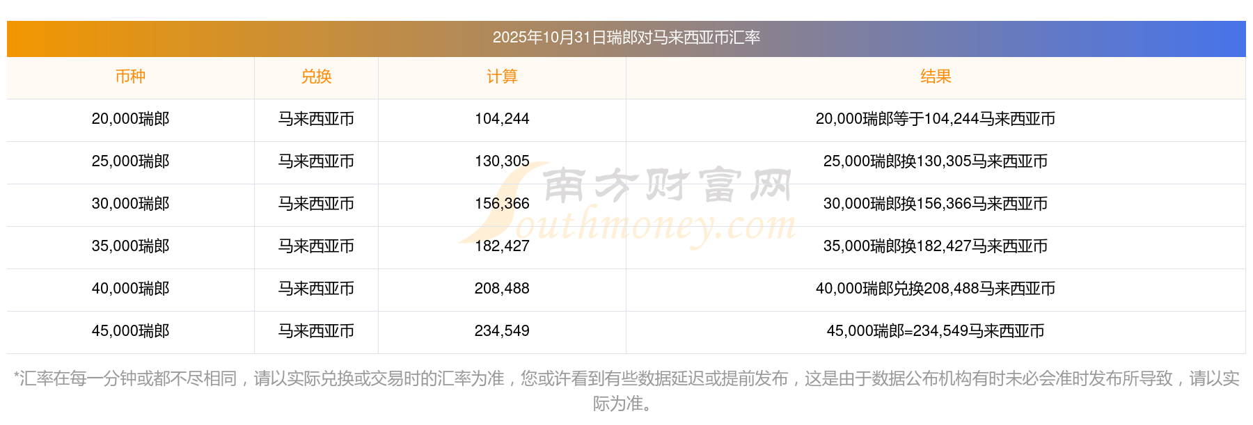 南方財富網(wǎng)為您提供瑞郎對馬來西亞幣匯率最新價格詳情。