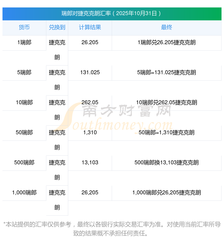 今天匯率更新!2025年10月31日65瑞郎兌換捷克克朗是多少?