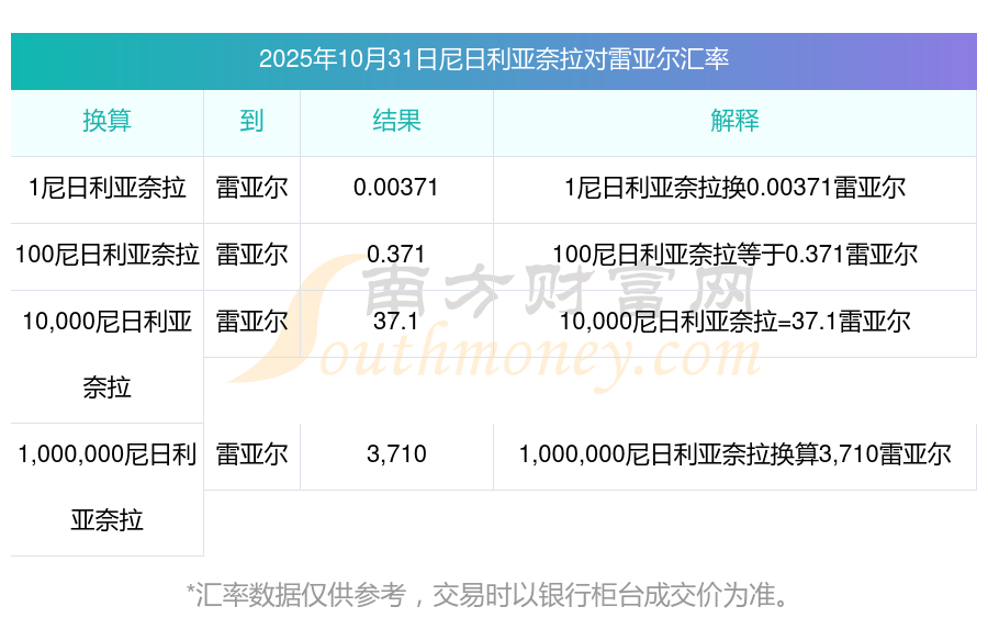 2025年10月31日尼日利亞奈拉兌換雷亞爾匯率是:0.00371