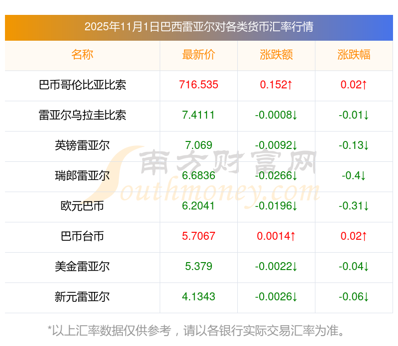 2025年11月1日巴西雷亞爾相關(guān)匯率查詢
