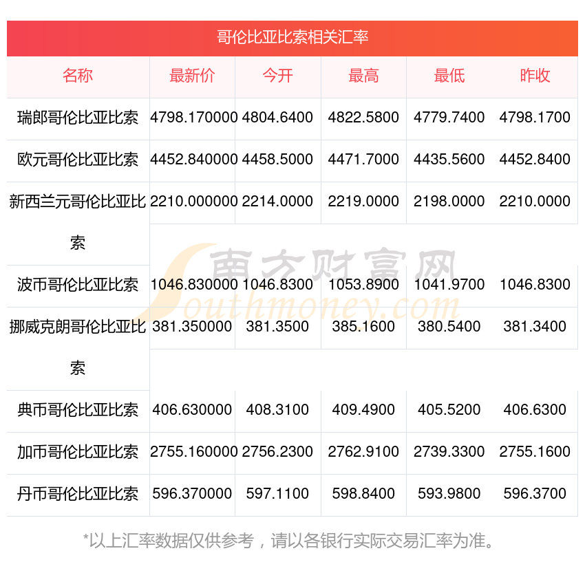 南方財(cái)富網(wǎng)為您提供哥倫比亞比索對(duì)美元匯率最新價(jià)格詳情。