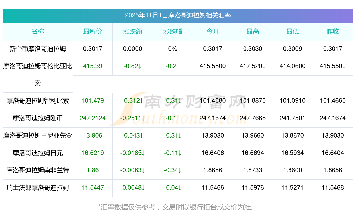 2025年11月1日摩洛哥迪拉姆相關(guān)匯率查詢