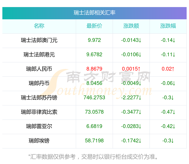 南方財(cái)富網(wǎng)為您提供瑞士法郎對(duì)挪朗匯率最新價(jià)格詳情。
