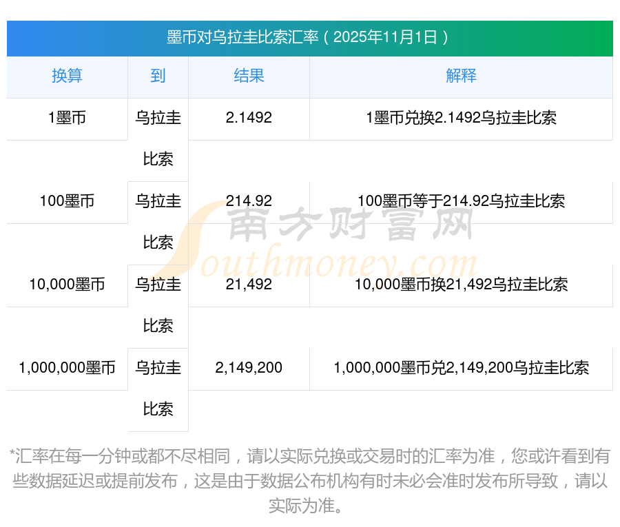 匯率實(shí)時(shí)更新!61墨幣兌換烏拉圭比索匯率表(2025年11月1日)