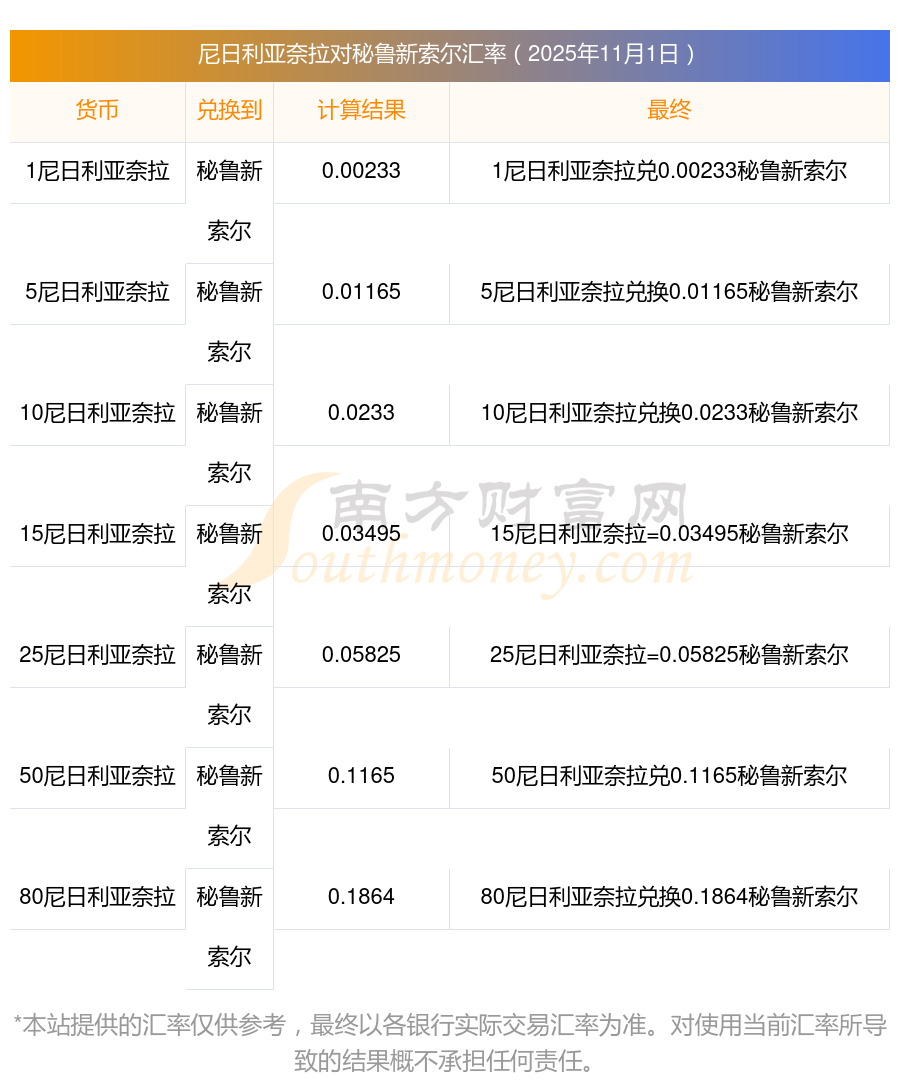 南方財(cái)富網(wǎng)為您提供尼日利亞奈拉對(duì)秘魯新索爾匯率最新價(jià)格詳情。
