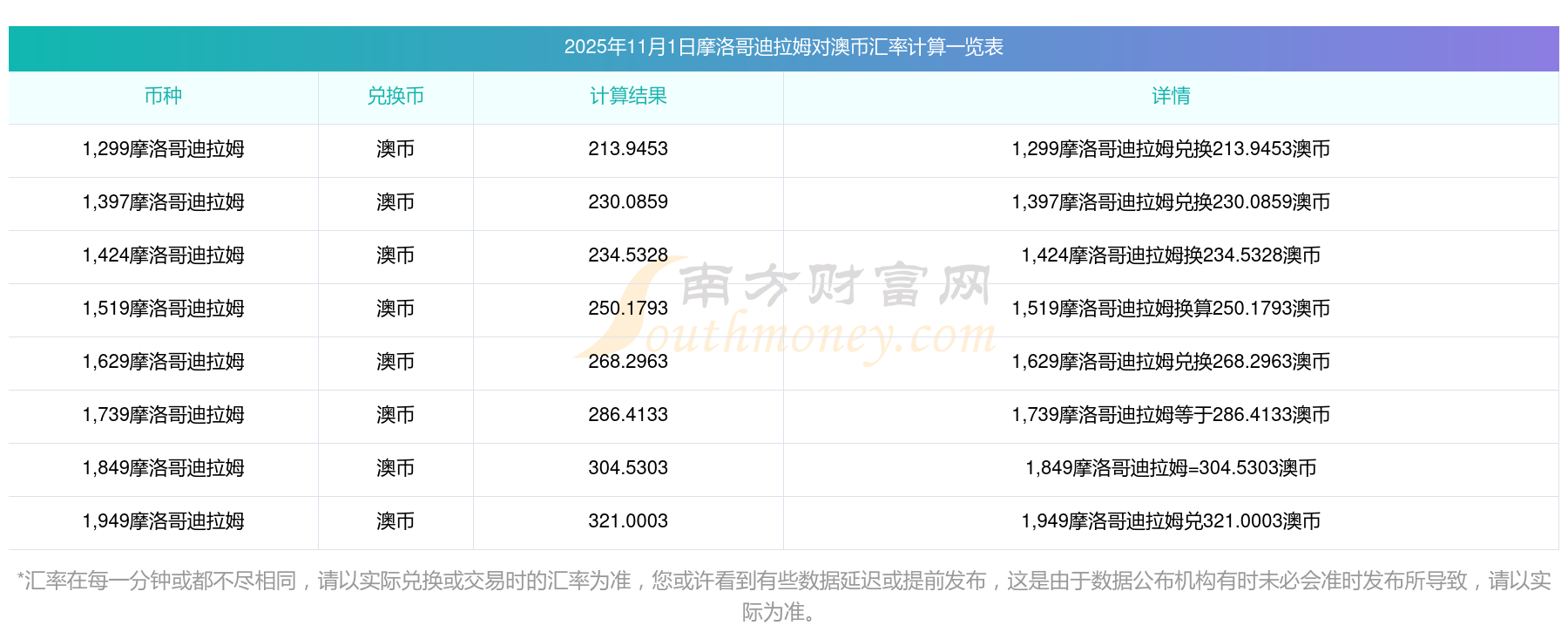 摩洛哥迪拉姆16折算成澳幣匯率今天行情2025年11月1日