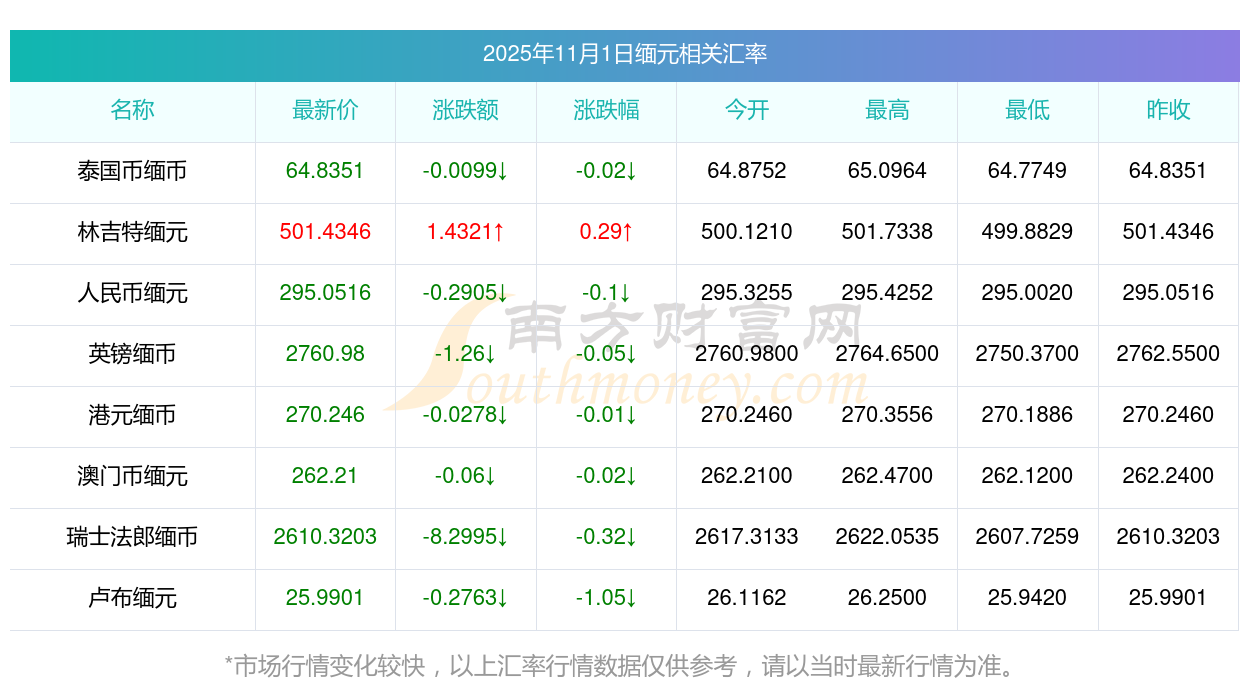 根據(jù)2025年11月1日匯率,緬元兌換斐濟(jì)幣匯率最新價0.001092,今開價0.0011,昨收價0.0011,最高價0.0011,最低價0.0011。