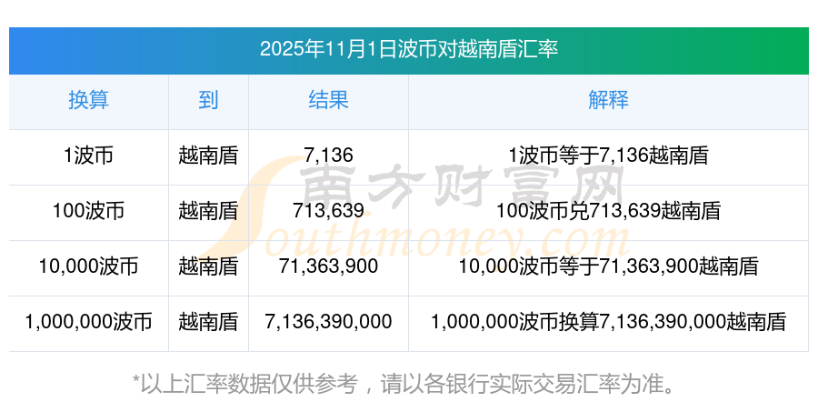 查詢匯率:今天波幣折算越南盾匯率一覽表11月1日