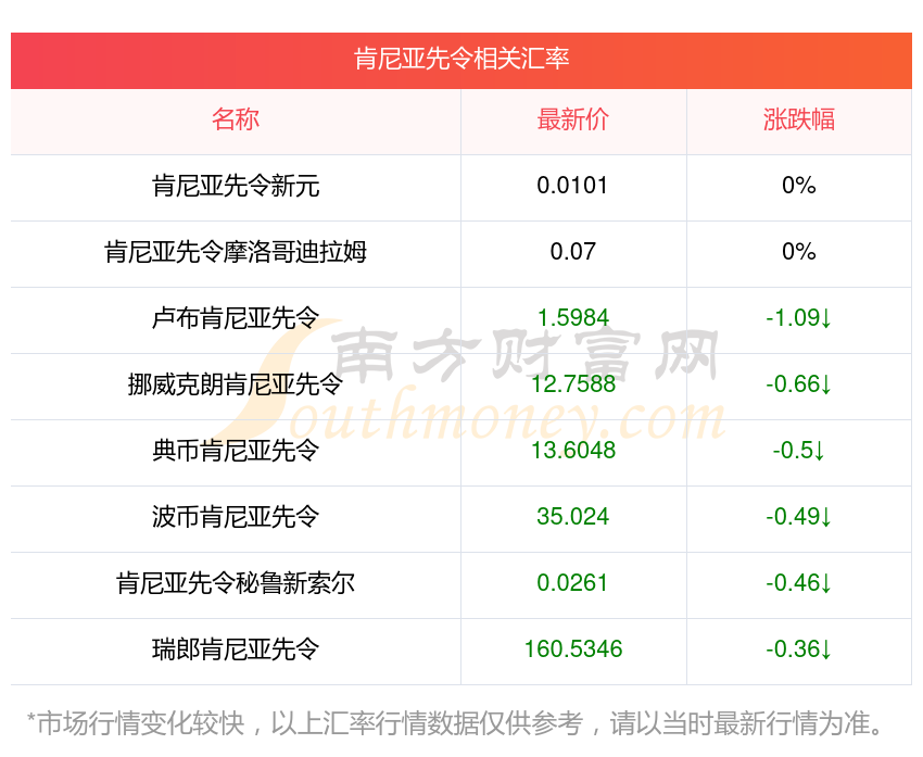 根據(jù)2025年11月1日匯率,肯尼亞先令兌換丹幣匯率最新價(jià)0.050100,今開價(jià)0.0500,昨收價(jià)0.0501,最高價(jià)0.0502,最低價(jià)0.0499。