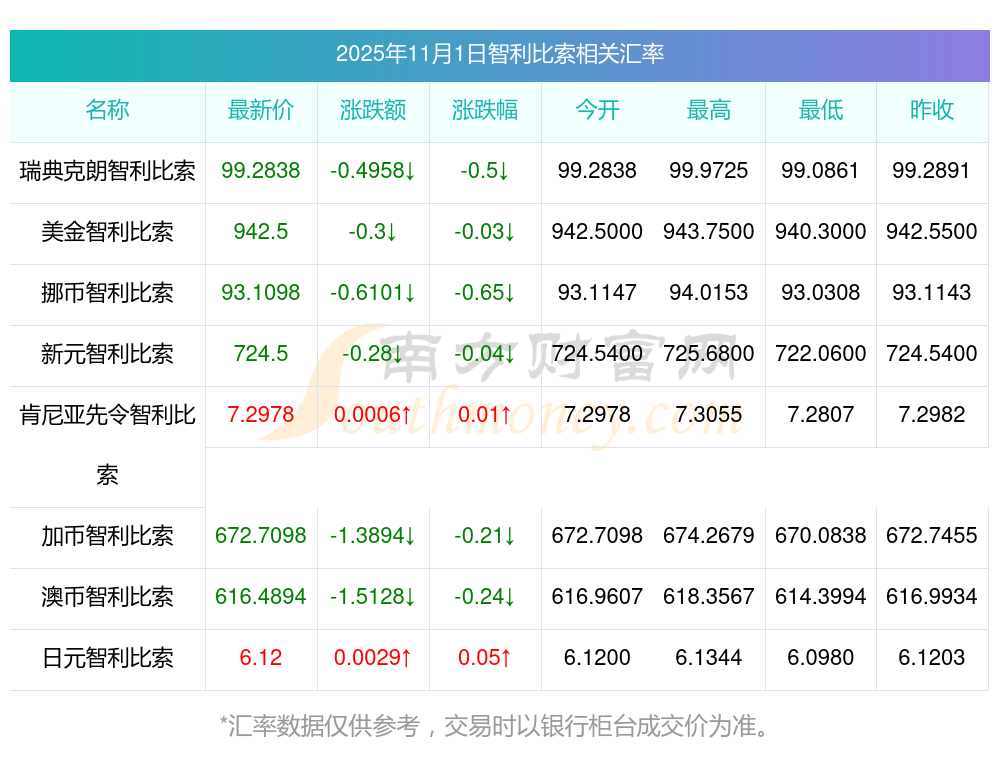 根據(jù)2025年11月1日匯率計(jì)算,智利比索兌換菲幣匯率最新價(jià)0.062360,今開(kāi)價(jià)0.0624,昨收價(jià)0.0623,最高價(jià)0.0625,最低價(jià)0.0622。
