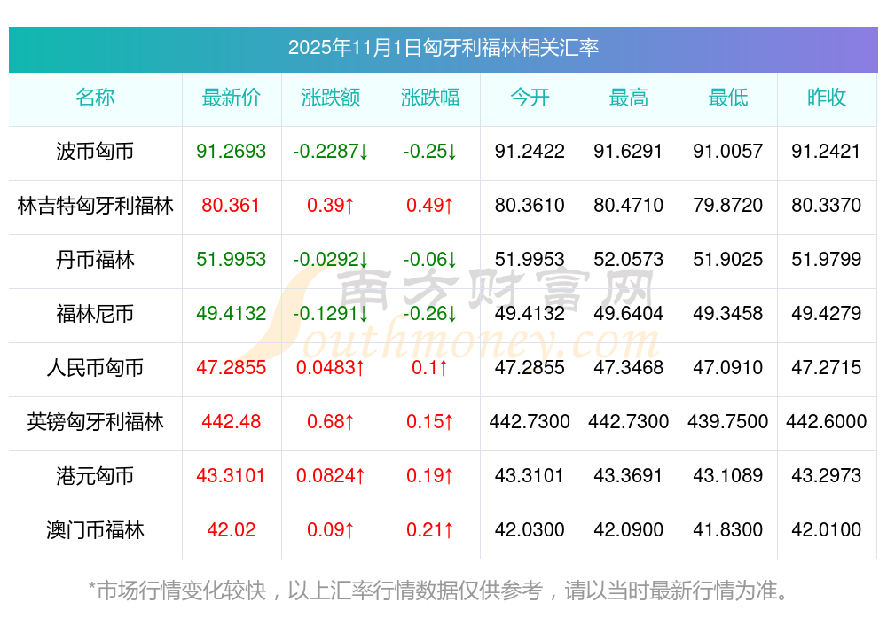 2025年11月1日匈牙利福林相關(guān)匯率查詢