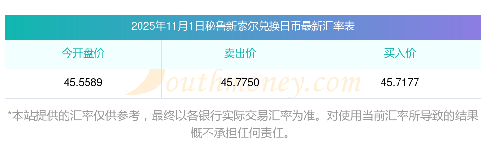 2025年11月1日秘魯新索爾兌換日幣匯率是:45.7464