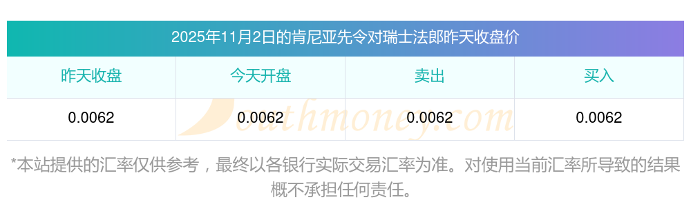 今日肯尼亞先令匯價表:2025年11月2日6肯尼亞先令兌瑞士法郎匯價多少