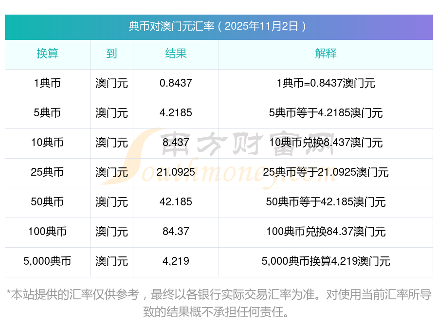 最新2025/11/2的典幣兌澳門元換算匯率多少?