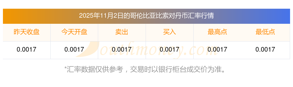 哥倫比亞比索兌換丹幣開盤價多少(2025年11月2日)