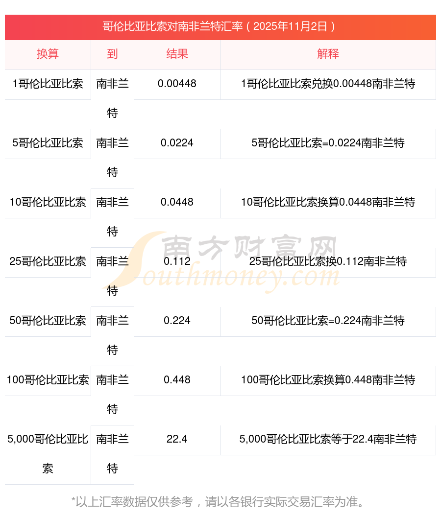 南方財富網(wǎng)為您提供哥倫比亞比索對南非蘭特匯率最新價格詳情。