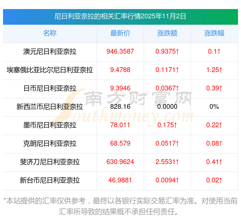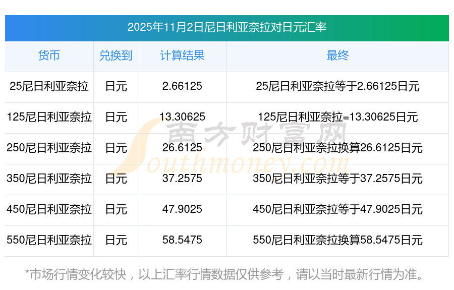 尼日利亞奈拉兌日元匯率每日匯率表2025/11/02