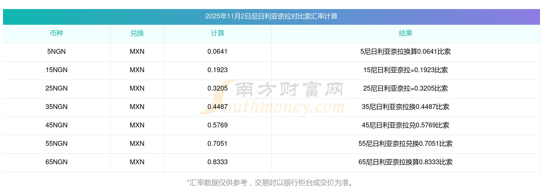 南方財(cái)富網(wǎng)為您提供尼日利亞奈拉兌換比索匯率最新價(jià)格詳情。