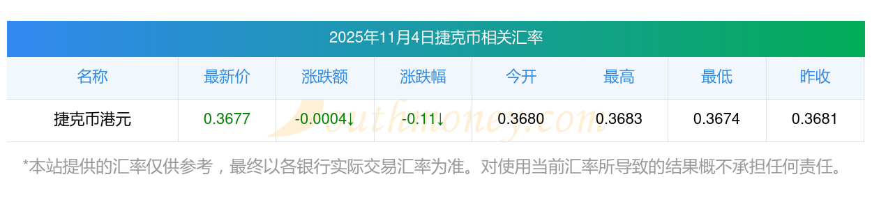 根據(jù)2025年11月4日匯率,捷克幣兌換港元匯率最新價(jià)0.367700,今開價(jià)0.3680,昨收價(jià)0.3681,最高價(jià)0.3683,最低價(jià)0.3674。