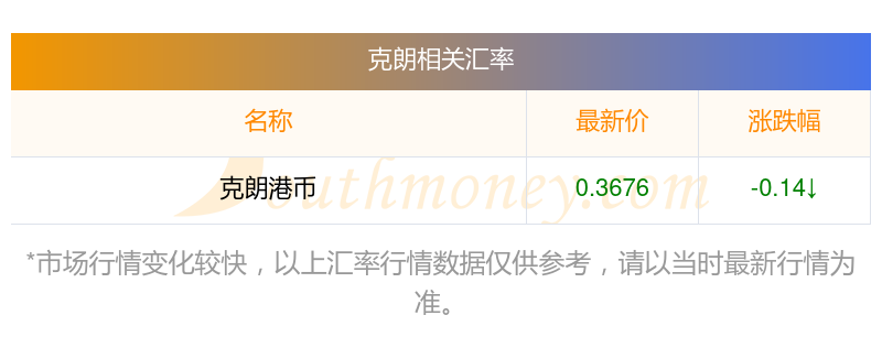 根據(jù)2025年11月4日匯率,克朗兌換港幣匯率最新價(jià)0.367600,今開價(jià)0.3680,昨收價(jià)0.3681,最高價(jià)0.3683,最低價(jià)0.3674。
