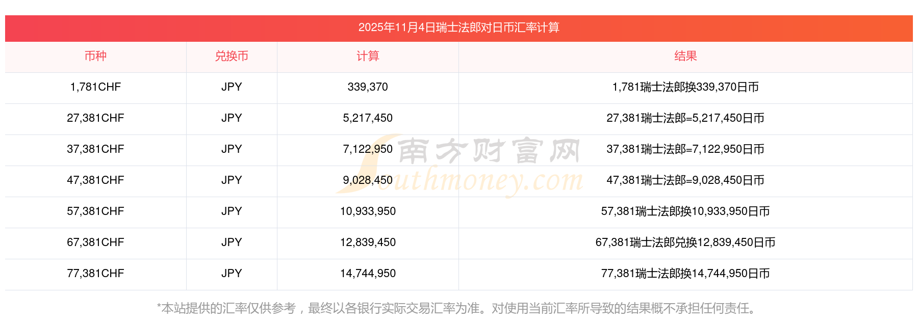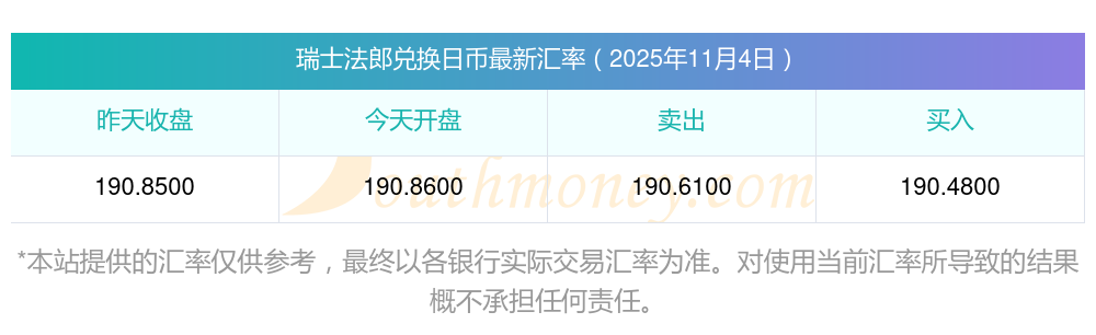 瑞士法郎今日匯率調(diào)整:瑞士法郎對日元匯率多少?2025-11-04