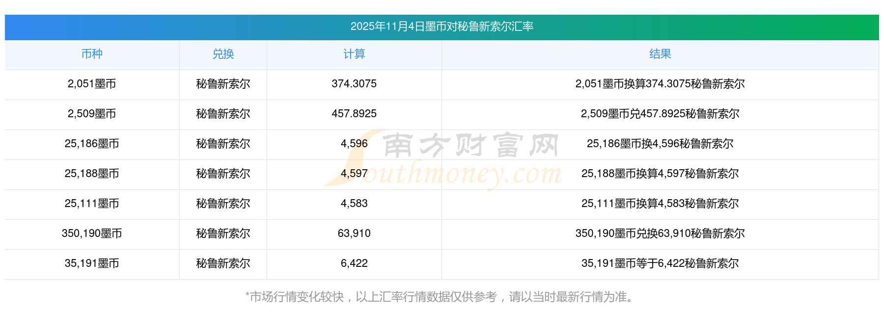 2025年11月4日2墨幣計(jì)算秘魯新索爾等于多少?