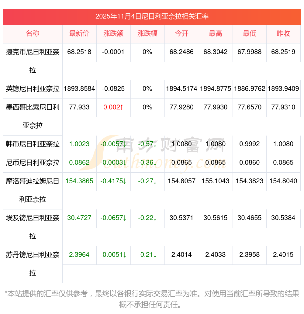 2025年11月4日尼日利亞奈拉相關匯率查詢