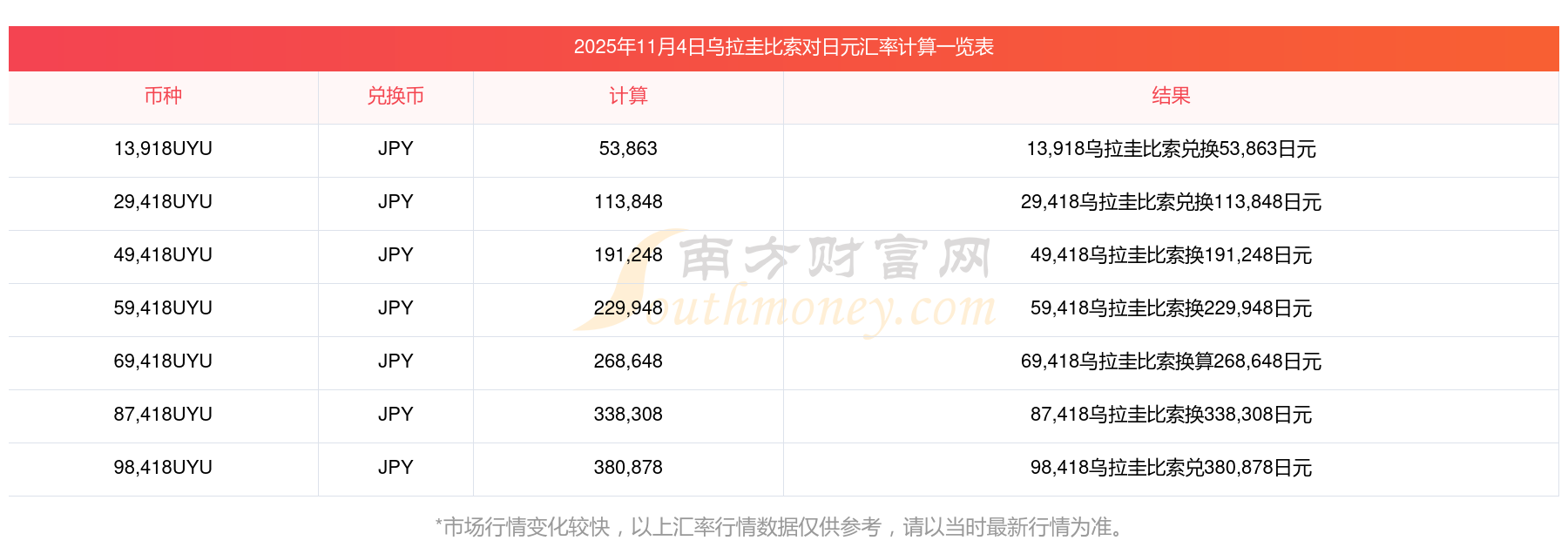 南方財(cái)富網(wǎng)為您提供烏拉圭比索對(duì)日元匯率最新價(jià)格詳情。