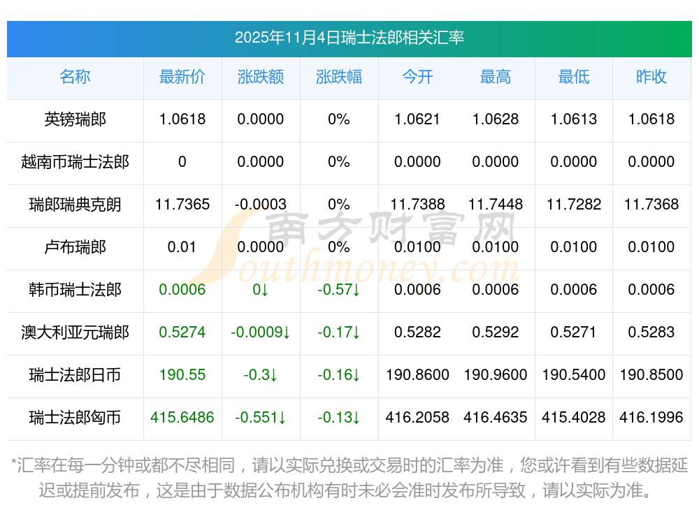 2025年11月4日瑞士法郎相關(guān)匯率查詢