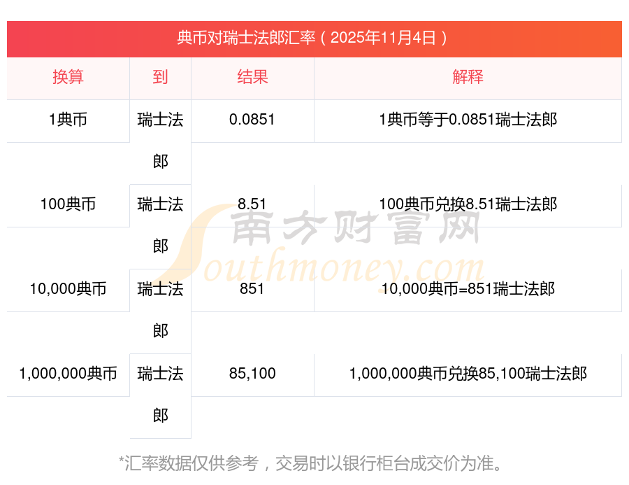 典幣對瑞士法郎匯率行情一覽(2025年11月4日)