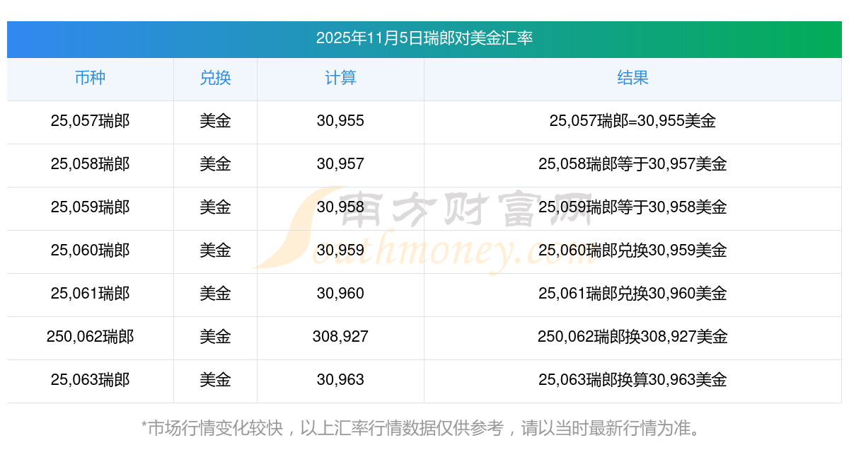 南方財(cái)富網(wǎng)為您提供瑞郎對(duì)美金匯率最新價(jià)格詳情。