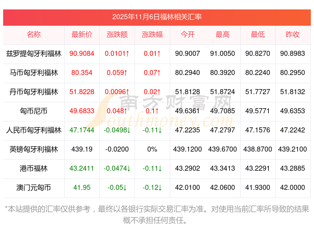 2025年11月6日福林兌換智利比索最新匯率:2.806000,今開:2.8030,昨收:2.8030,最高:2.8071,最低:2.7997。