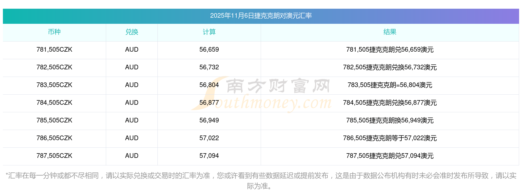 今天匯率計(jì)算:57捷克克朗等于多少澳元的?(2025年11月6日)