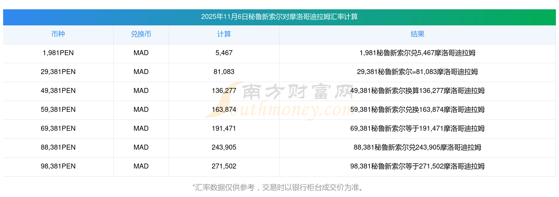 南方財富網為您提供秘魯新索爾對摩洛哥迪拉姆匯率最新價格詳情。