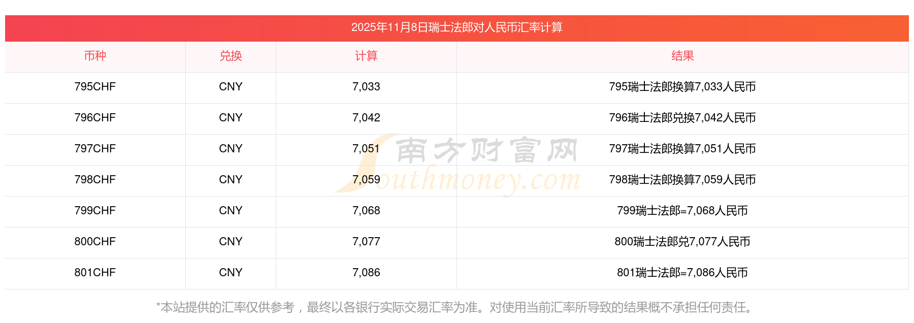 今日瑞士法郎匯率中間價:1瑞士法郎對人民幣多少元?2025-11-8