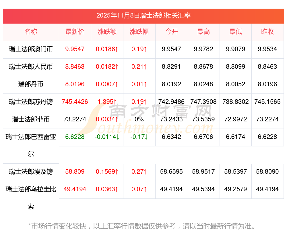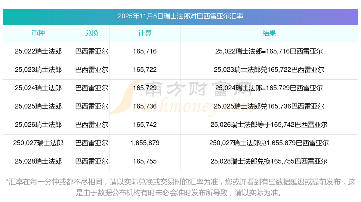 今天的匯率行情 瑞士法郎轉(zhuǎn)換巴西雷亞爾匯率價(jià)是多少? 2025/11/8