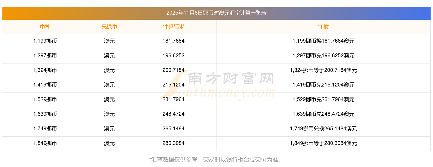 今天2挪幣兌換澳元是多少?2025年11月8日