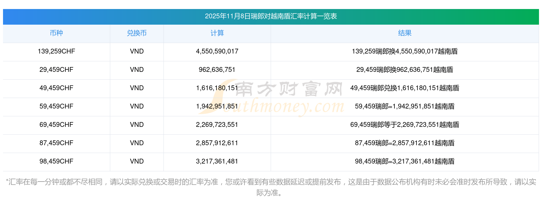 南方財(cái)富網(wǎng)為您提供瑞郎對越南盾匯率最新價(jià)格詳情。