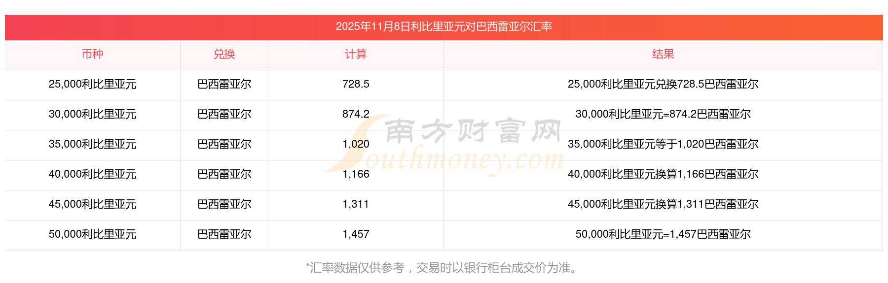 利比里亞元換巴西雷亞爾實(shí)時(shí)匯率查詢表 2025年11月8日