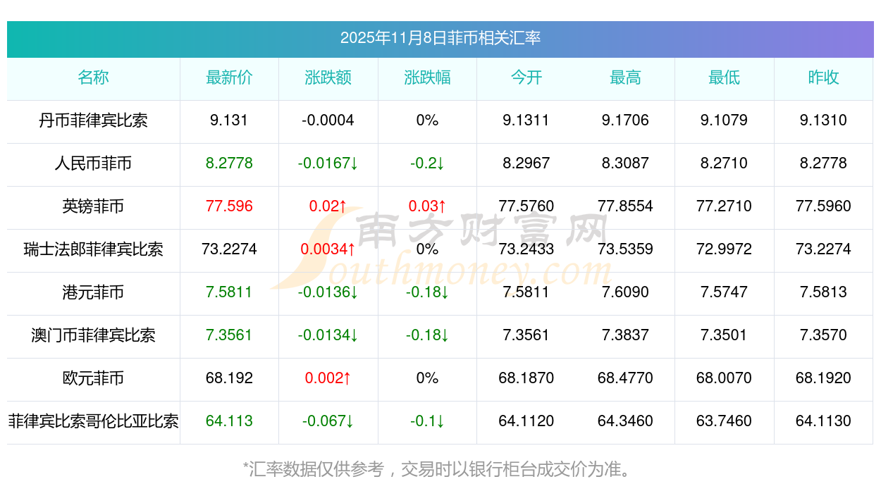根據(jù)2025年11月8日匯率,菲幣兌換摩洛哥迪拉姆匯率最新0.157100,今開0.1572,昨收0.1572,最高0.1576,最低0.1567。