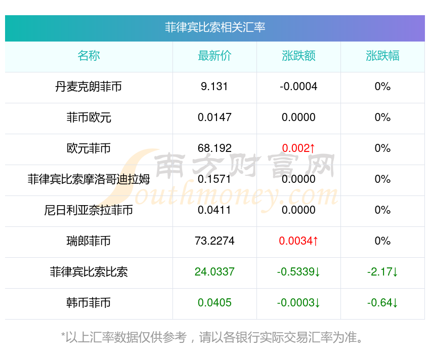 根據(jù)2025年11月8日匯率,菲律賓比索兌換比索匯率最新價24.033700,今開價24.5612,昨收價24.0337,最高價24.6910,最低價23.9746。