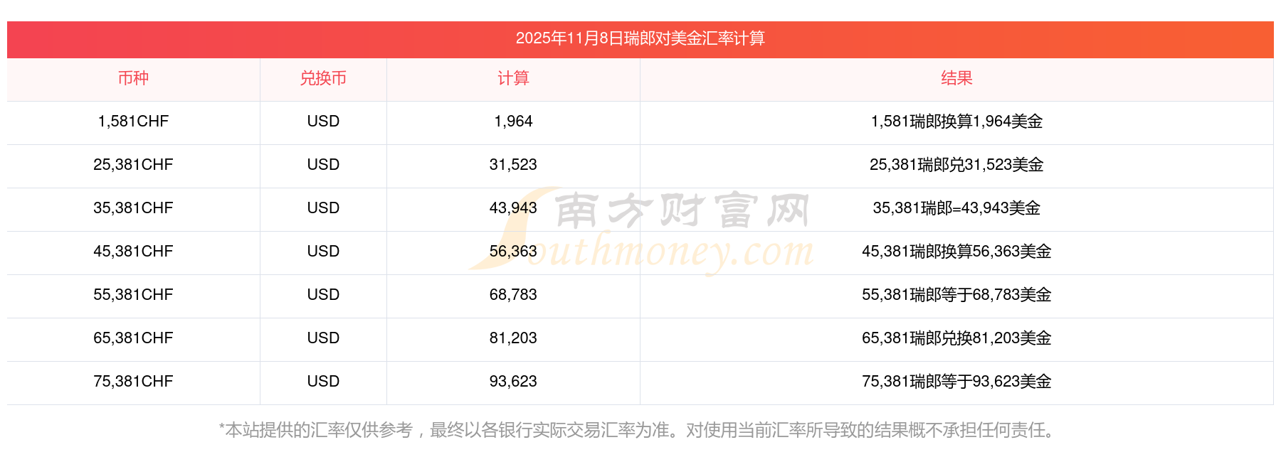 現(xiàn)在1瑞士法郎與美元的匯率是多少?2025/11/8