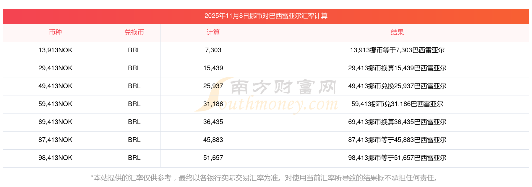 今天挪幣購匯查詢:今天挪幣對巴西雷亞爾匯率是多少?2025-11-8