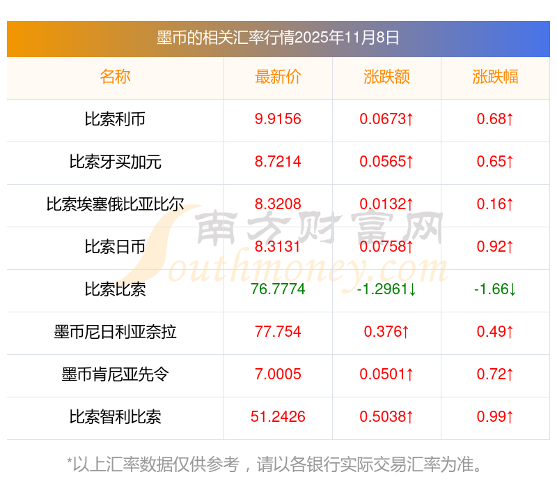 根據(jù)2025年11月8日匯率,墨幣兌換肯尼亞先令匯率最新價7.000500,今開價7.0005,昨收價6.9994,最高價7.0058,最低價6.9440。