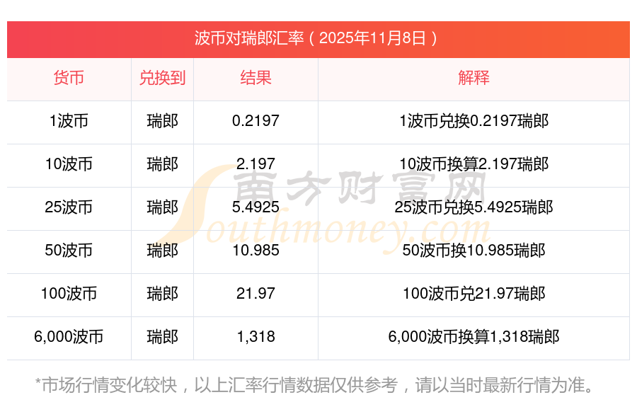 南方財富網(wǎng)為您提供波幣對瑞郎匯率最新價格詳情。