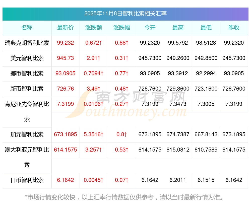 2025年11月8日智利比索相關匯率查詢