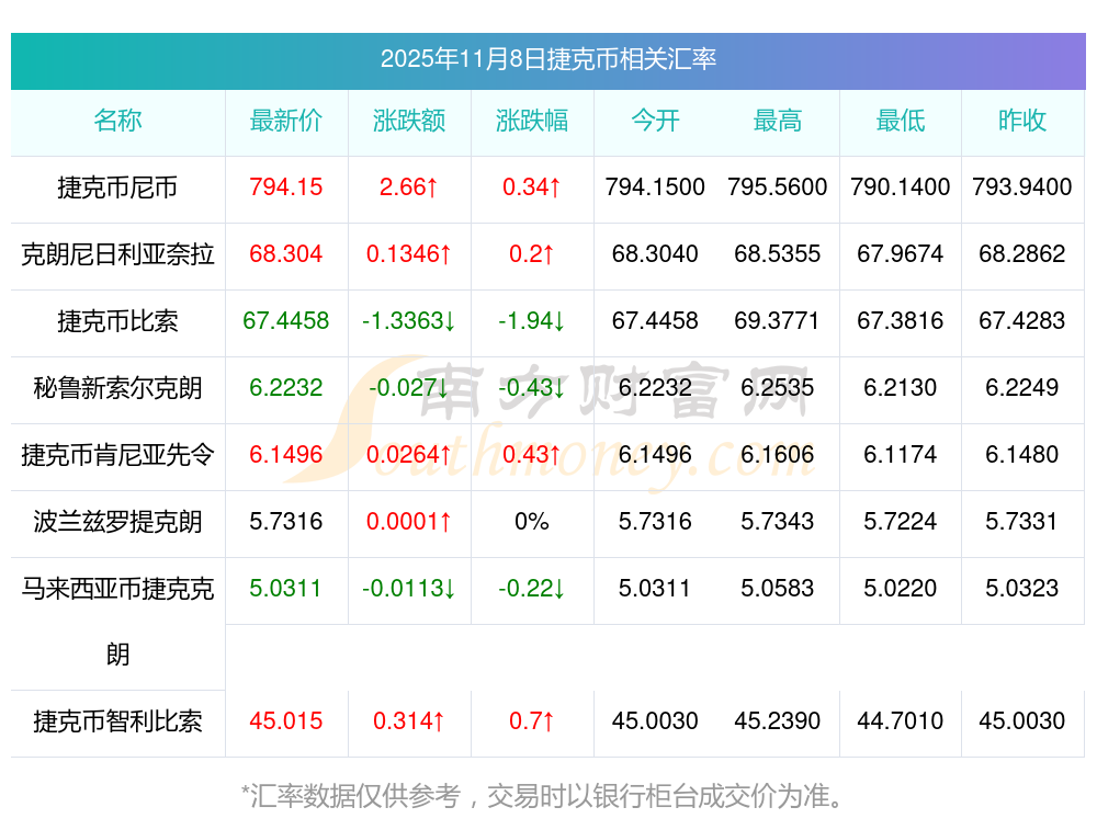 2025年11月8日捷克幣相關(guān)匯率查詢